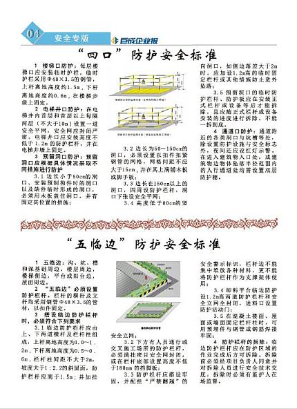 1 五临边:沟、坑、槽和深基础周边,楼层周边,楼梯侧边,平台或阳台边,屋面周边。