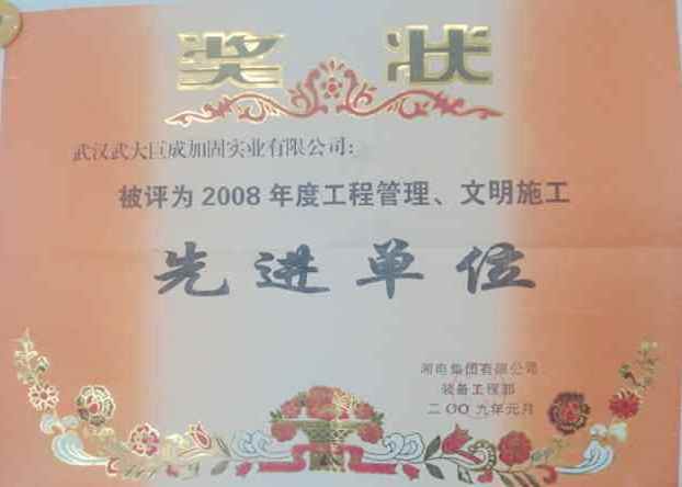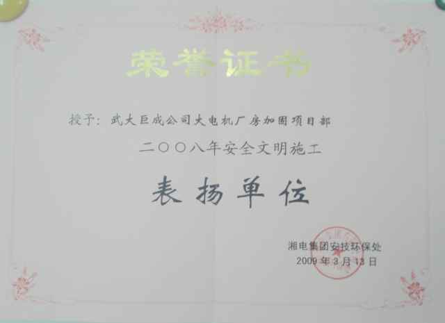 武大巨成在五十多家施工单位中被湘潭电机集团评为优秀施工单位,项目经理胡正彦被评为优秀项目经理!获此殊荣的仅武大巨成及湖南华湘集团两家单位。