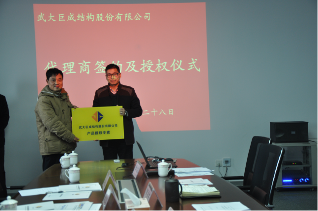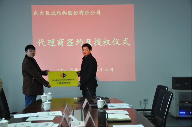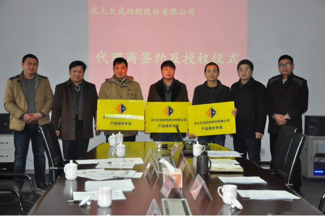 武大巨成结构股份有限公司第一批代理商签约暨授权仪式于2015年12月28日在公司隆重举行,参与本次签约的代理商有:湖北今一建筑科技有限公司﹑南京固鸿嘉工程技术有限公司、武汉兴洪诚建材五金有限公司。仪式由公司副总经理万雄卫主持,公司总经理闵启武致欢迎词并介绍了公司发展历程,副总经理万雄卫介绍了公司材料销售的总体思路,销售部张化良介绍了代理商相关管理办法,双方就合作开展了积极的讨论,大家都表示对未来的合作充满信心,本次活动正式拉开了武大巨成材料营销模式转变的序幕。