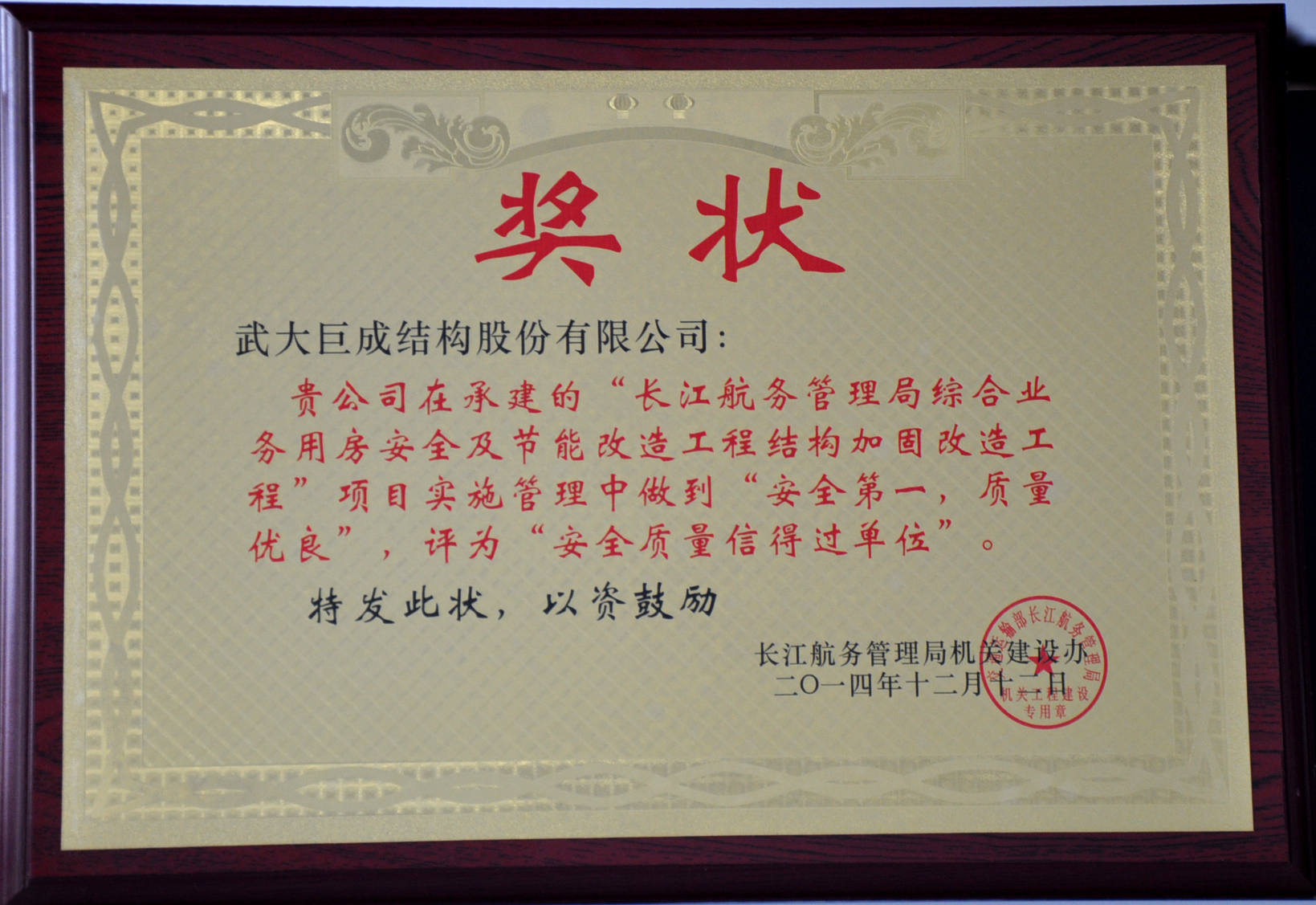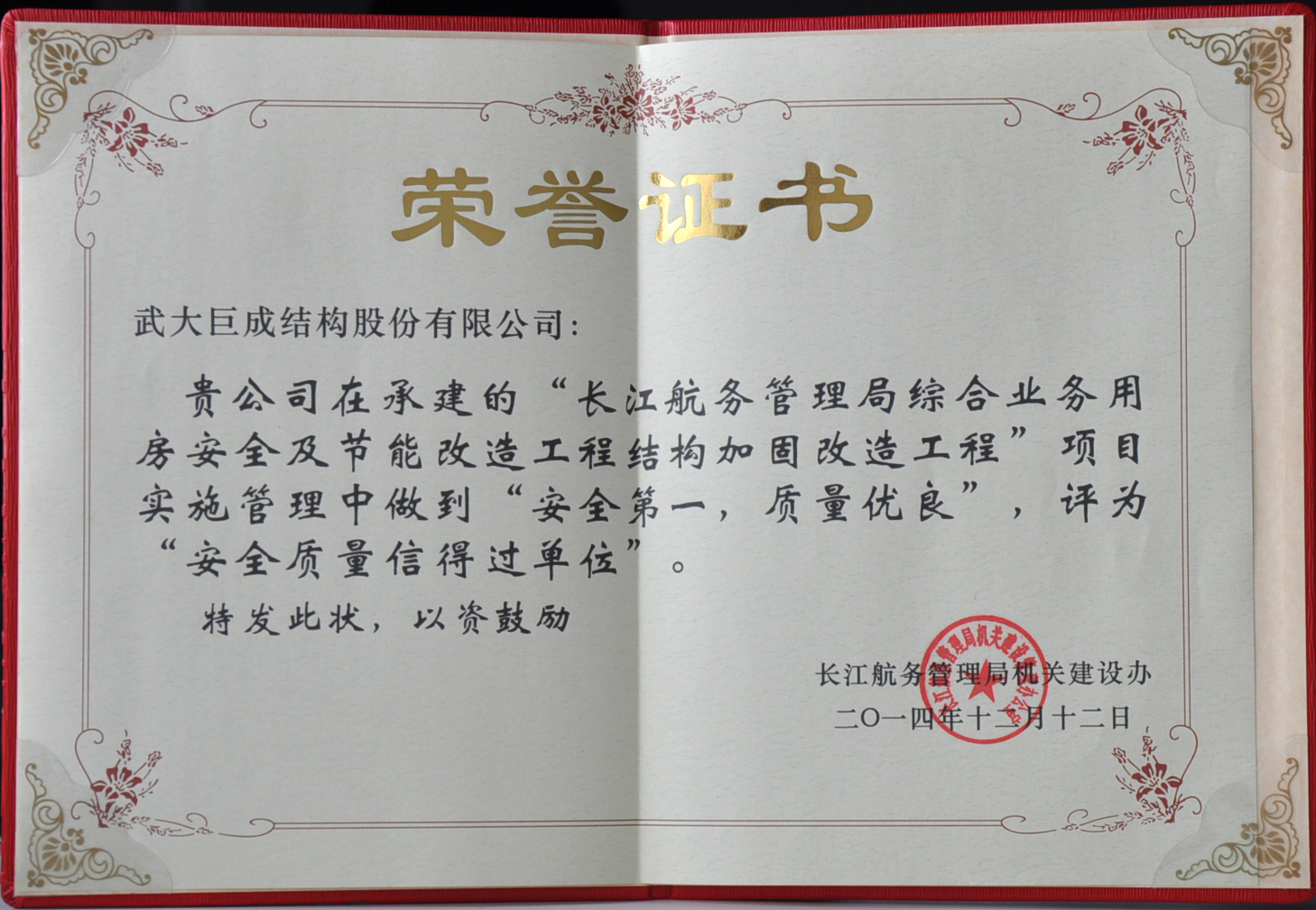因我公司在承建的“长江航务管理局综合业务用房安全及节能改造工程结构加固改造工程”项目实施管理中坚持“安全第一、质量优良”的原则,成绩突出。