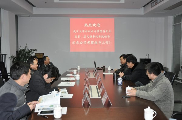 2014年12月31日下午,武汉大学水利水电学院院长黄介生、党委书记屈文谦率副院长梅亚东、周伟及副书记周韶伟、水工岩石力学实验室主任卢文波等院主要党政领导,到我公司巨成大厦十六楼一号会议室进行了工作考察与交流。公司董事长高作平、董事陈明祥、总经理闵启武、董事兼副总经理万雄卫、董事会秘书兼财务部长李庆友及首席专家李北星等参加了接待工作。